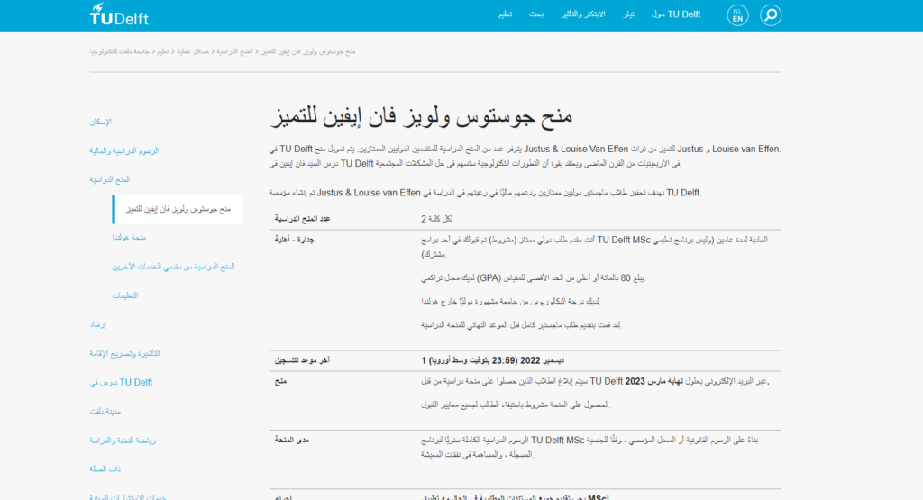 منح جوستوس ولويز فان إيفين للتميز بجامعة ديلفت مقدمة للطلاب الدوليين وهي متاحة لدراسات الماجستير في جامعة دلفت للتكنولوجيا في هولندا وتوفر هذه المنح الدراسية للطلاب ما يقارب 30،000 يورو في السنة وتغطي الرسوم الدراسية ونفقات المعيشة واللغة المطلوبة هي الإنكليزية ويجب أن يكون الطالب حاصل على 80 في المائة أو أعلى من الحد الأقصى في درجة البكالوريوس.