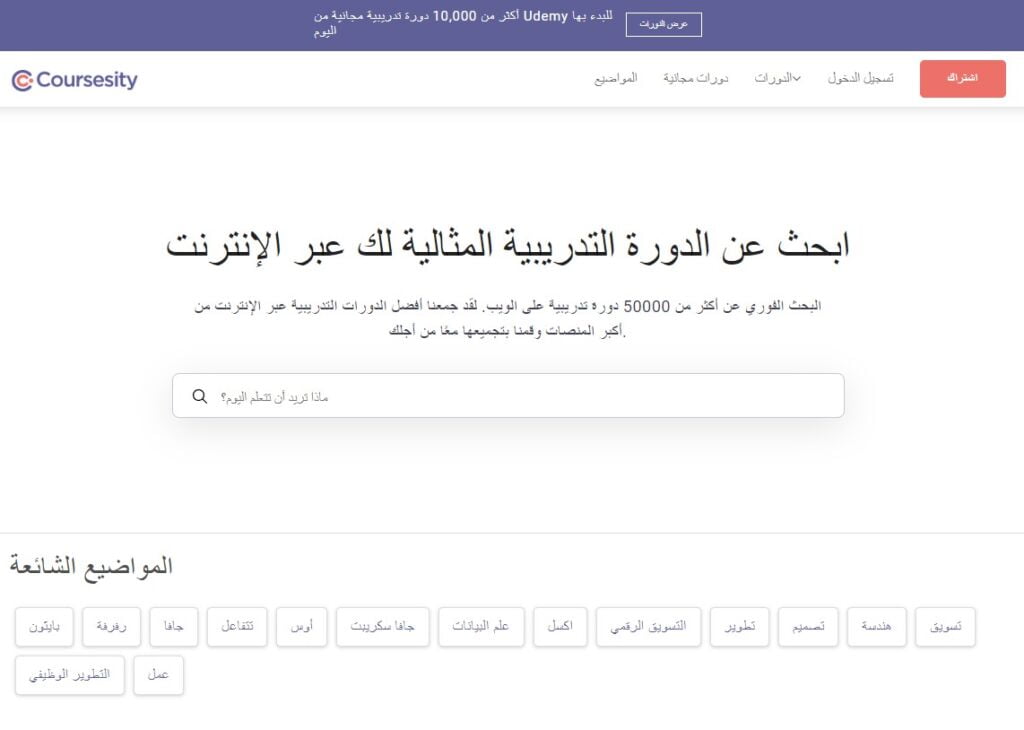 من خلال موقع Coursesity يمكنك الحصول على الدورة التدريبية المثالية لك عبر الإنترنت، حيث يتيح لكم Coursesity البحث الفوري عن أكثر من 50000 من أفضل الدورات التدريبية عبر الإنترنت ومن أكبر المنصات عبر الانترنت بالعربي.