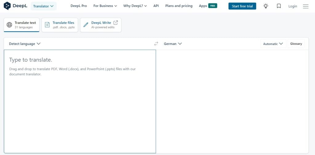 يتيح موقع DeepL Translate للمستخدمين ترجمة الملفات والنصوص بدقة عالية وسرعة مذهلة، ويتعامل الموقع مع مختلف أنواع النصوص، بدءًا من النصوص القصيرة وصولًا إلى الملفات الكبيرة والمستندات المعقدة.