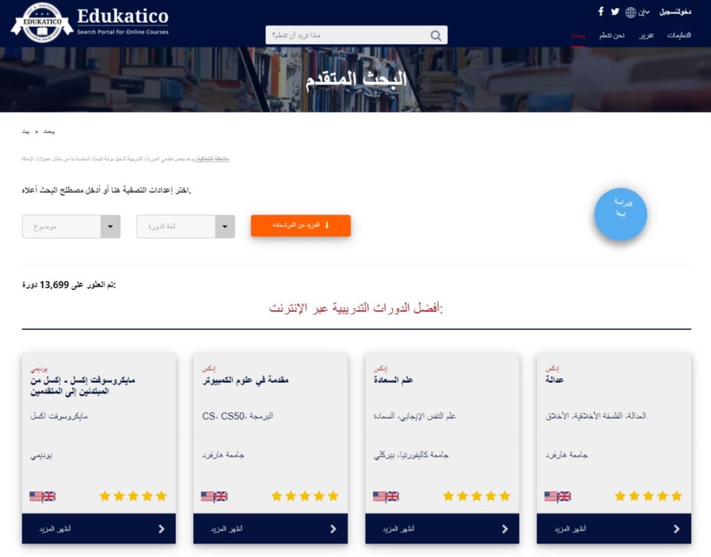 موقع Edukatico افضل موقع دورات مجانية عبر الانترنت وهو بوابة بحث مجانية ومستقلة للدورات التدريبية عبر الإنترنت، من مختلف مقدمي الدورات التدريبية، ويقدم Edukatico دليل يضم 8051 دورة فيديو من أكثر من 50 مزود.