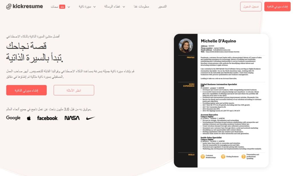 زيارة موقع Kickresume أفضل موقع بالذكاء الاصطناعي لإنشاء cv