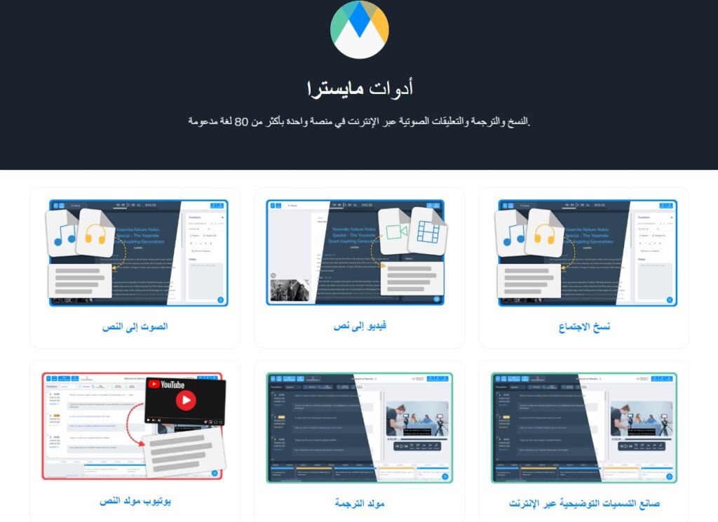 تشمل الأدوات التي يقدمها موقع مايسترا، النسخ والترجمة والتعليقات الصوتية عبر الإنترنت في منصة واحدة بأكثر من 80 لغة مدعومة، وتتضمن الأدوات ما يلي: