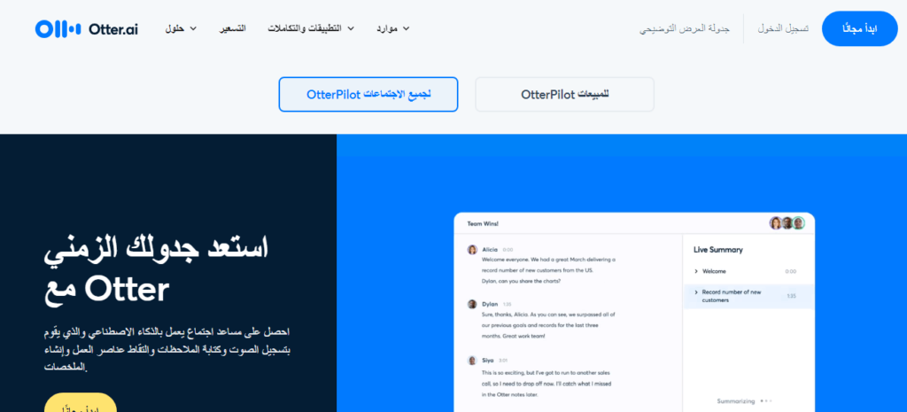- Otter AI يستخدم مساعد اجتماعات ذكي لتسجيل وتفريغ الاجتماعات بالنص في الوقت الفعلي، والتقاط الشرائح ، واستخراج عناصر العمل، وإنشاء ملخص اجتماع ذكي.