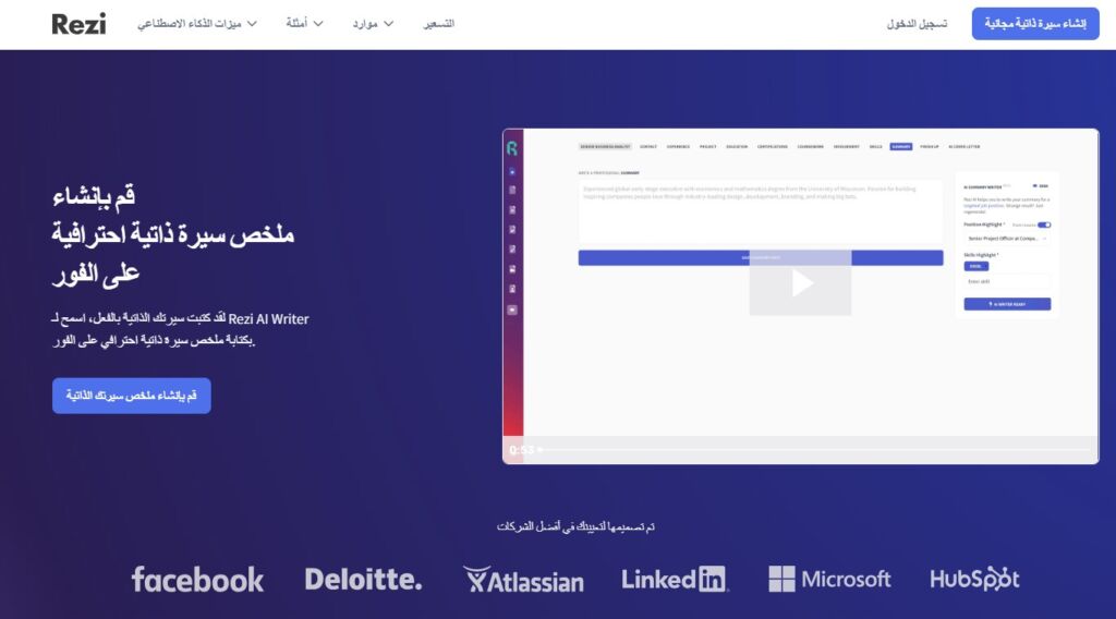 موقع Rezi هو منصة السيرة الذاتية الوحيدة التي تستخدم الذكاء الاصطناعي الرائد لأتمتة كل جانب من جوانب إنشاء السيرة الذاتية القابلة للتوظيف وتشمل الكتابة والتحرير والتنسيق والتحسين، وتتضمن قوالب لمساعدتك في تصميم سيرة ذاتية احترافية.