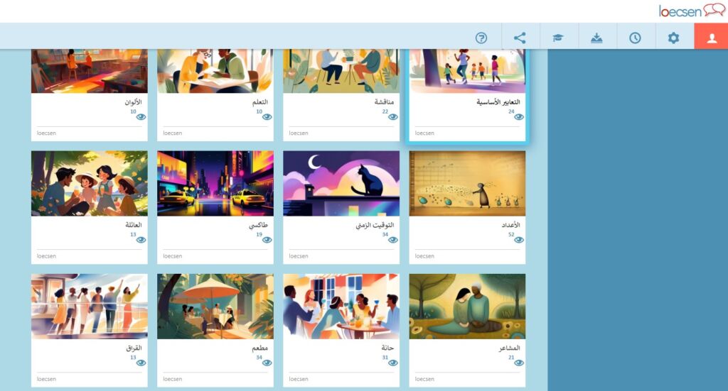 - بمجرد اختيار اللغة، ستظهر لك قائمة بالمواضيع المختلفة المتاحة للتعلم، يحتوي كل موضوع على تعلم المفردات والجمل أو عبارات مصورة والقواعد والنطق.